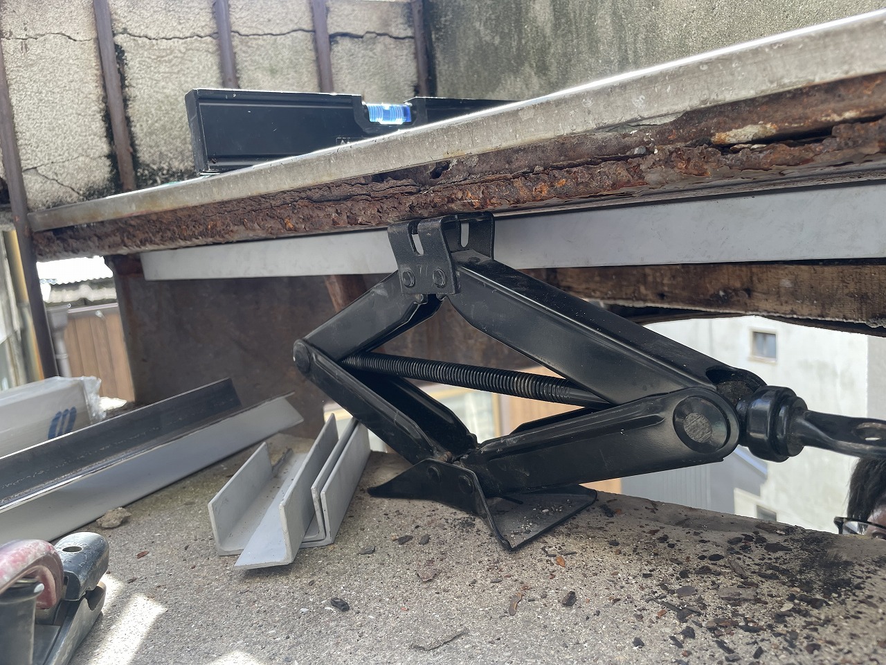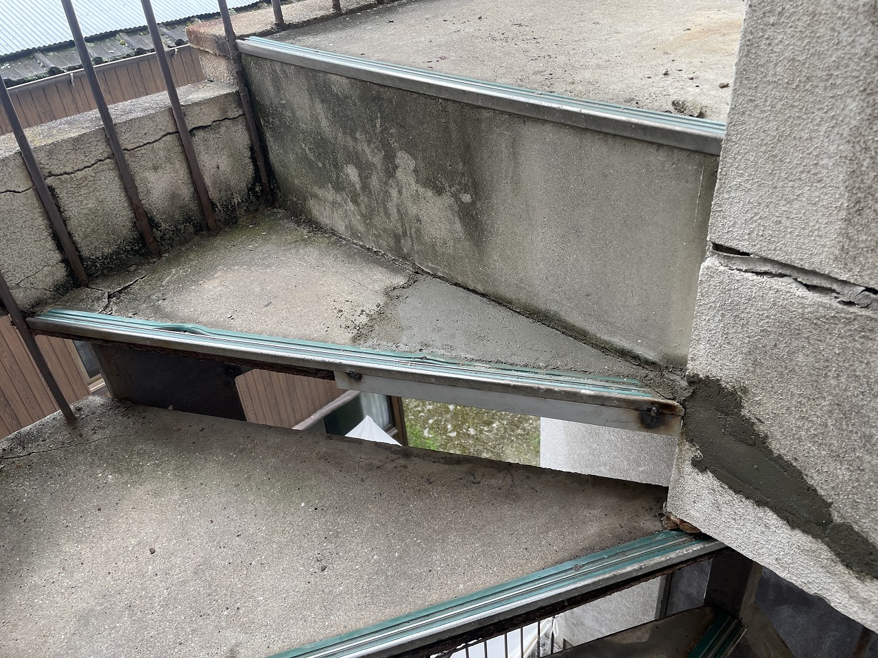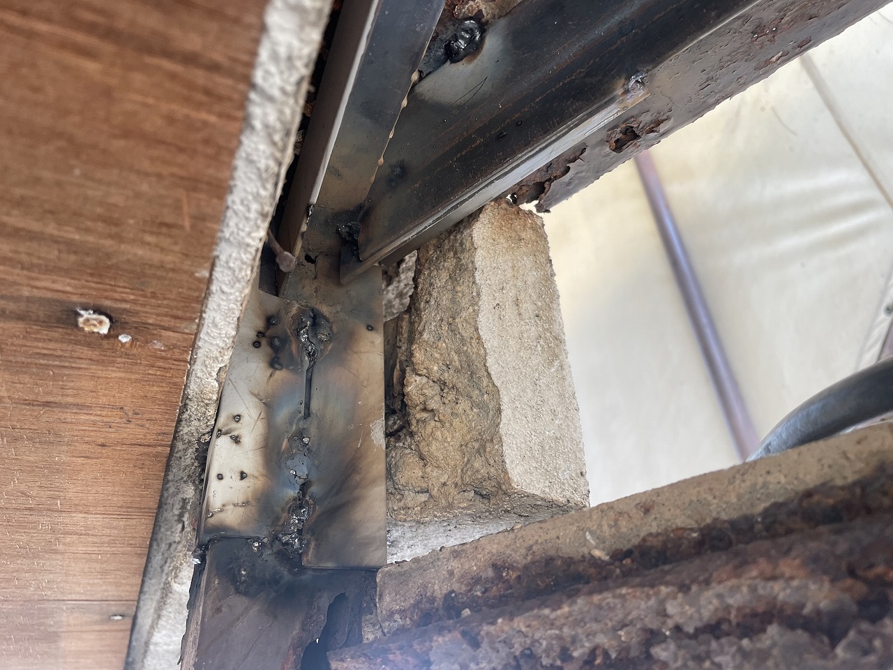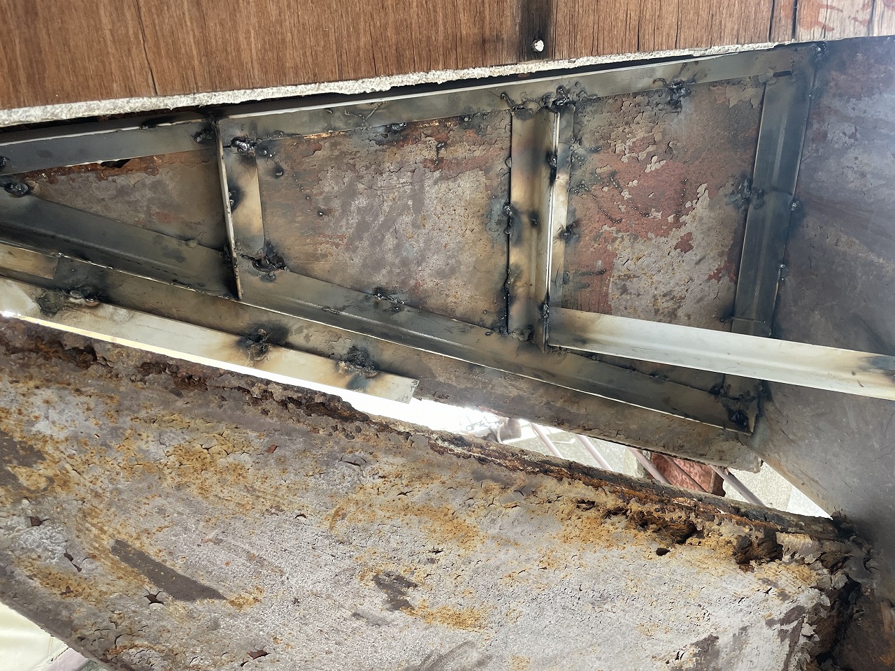 高松市 T様 階段補修工事 今回の工事は弊社の前を往来されていた時に看板を見て問い合わせていただいたお施主様になります。 お話をお伺いしたところ、最近建物の外にある階段の踏み板が腐って非常に危険だということで応急処置をしてほしいとの事でした。 階段補修工事前 破損状況 現地にお伺いして一目で「非常に危険!」と分かりました。 外付けの鉄骨階段の踏み板もモルタルが割れてそこから浸水して階段の鉄板が腐食していました。 階段補修工事開始 階段補修工事 お施主様と相談して今回は予算的なものと、使用期間が今年いっぱいまでしか使用しないとのことで補強材による補修としました。 補強材溶接 これは階段の下からの写真になります。手すり柱に仮付けと本溶接をしていきます。 溶接作業 補強材の取付がおわりました。 しっかりと本溶接もしていきます。 踏み板補修 踏み板の表側はモルタル補修を行いました。 階段補修工事完了 階段補修工事完了 最後に錆止めの塗装をして完了しました。 二重の補強を行っていますので年内は十分使用できると思います。 2024年8月30日工事実績溶接作業,鉄骨階段の補修