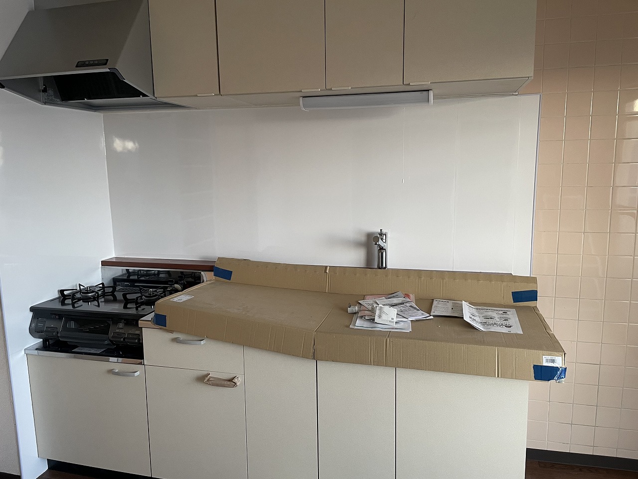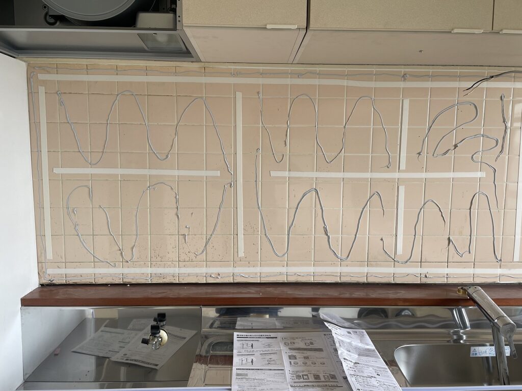 キッチンの設置が完了しましたら、壁面の仕上げとしてキッチンパネルを張っていきます。