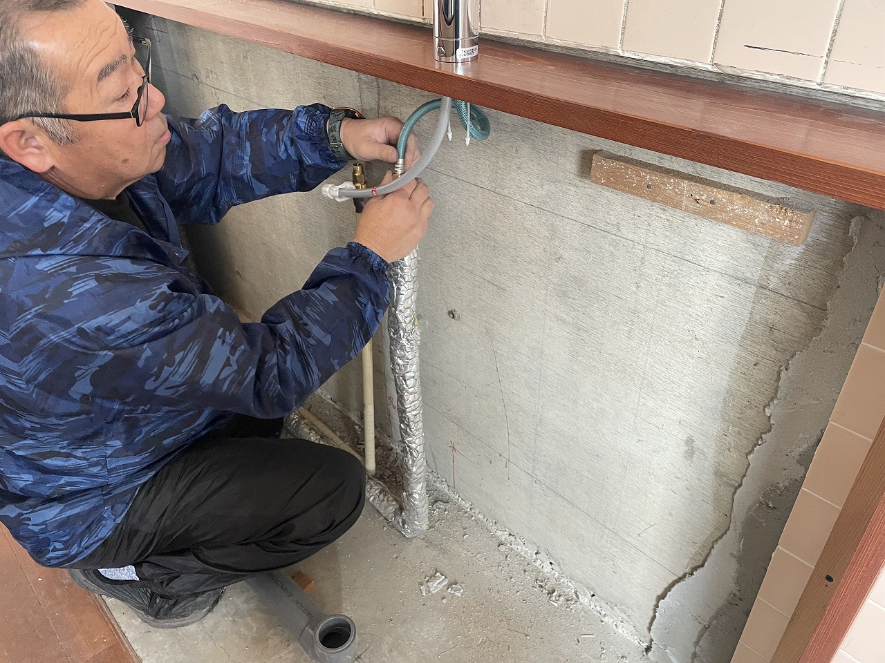 下地の大工工事の最中に水道関係の配管も済ませておきます。