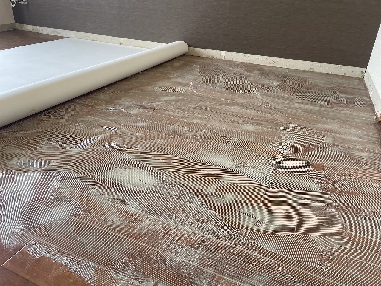 今回は上張りの為現状の床のクッションフロアーに直接張り付けていきます。
