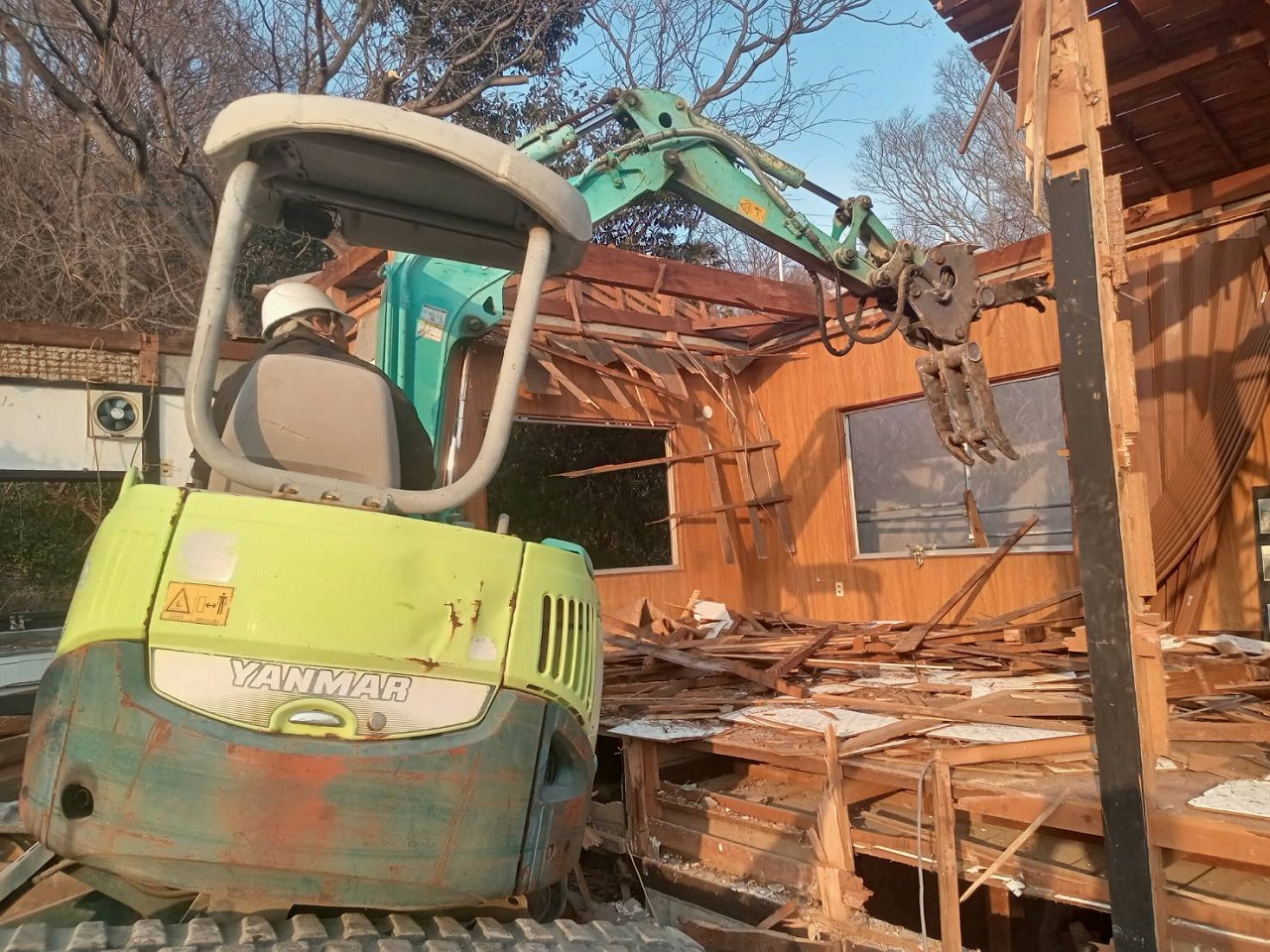 屋根瓦を撤去したら木造の躯体を重機で解体していきます。