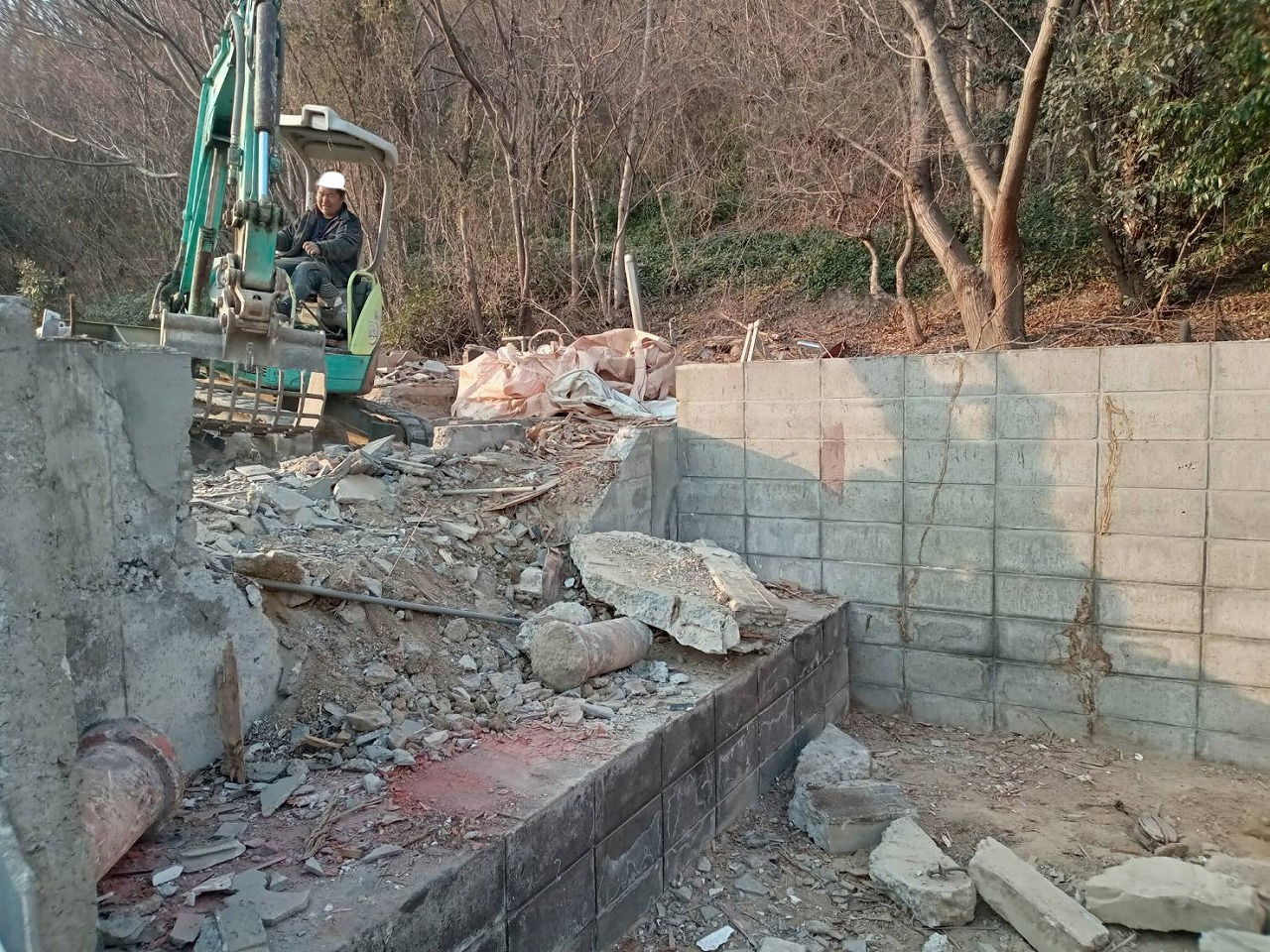 今回の現場も一部進入路が大変狭く2tダンプでギリギリ入れるぐらいの現場でした。解体工事において粉塵・騒音が発生しますのでお隣の方にご挨拶にお伺いしたところ、お隣の方の所有地を工事期間中お貸し頂けるとおことで大変助かりました。