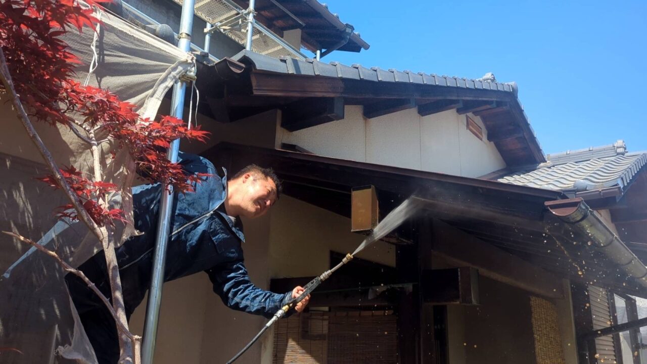 足場ができましたら外壁と樋などの役物の高圧洗浄を行います。