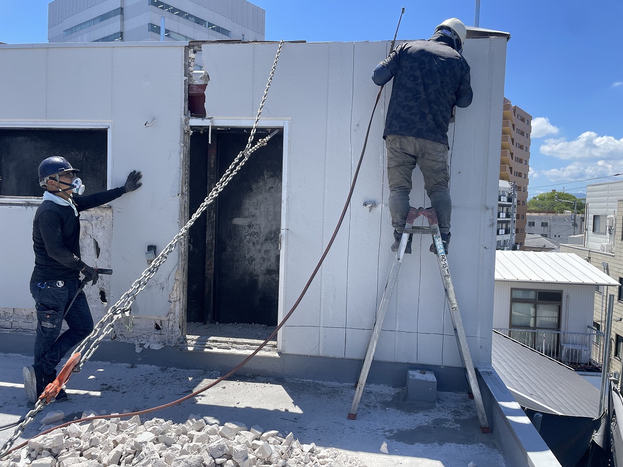 まず建屋周辺の作業用のスペース確保のため人力で建屋周囲を解体します。