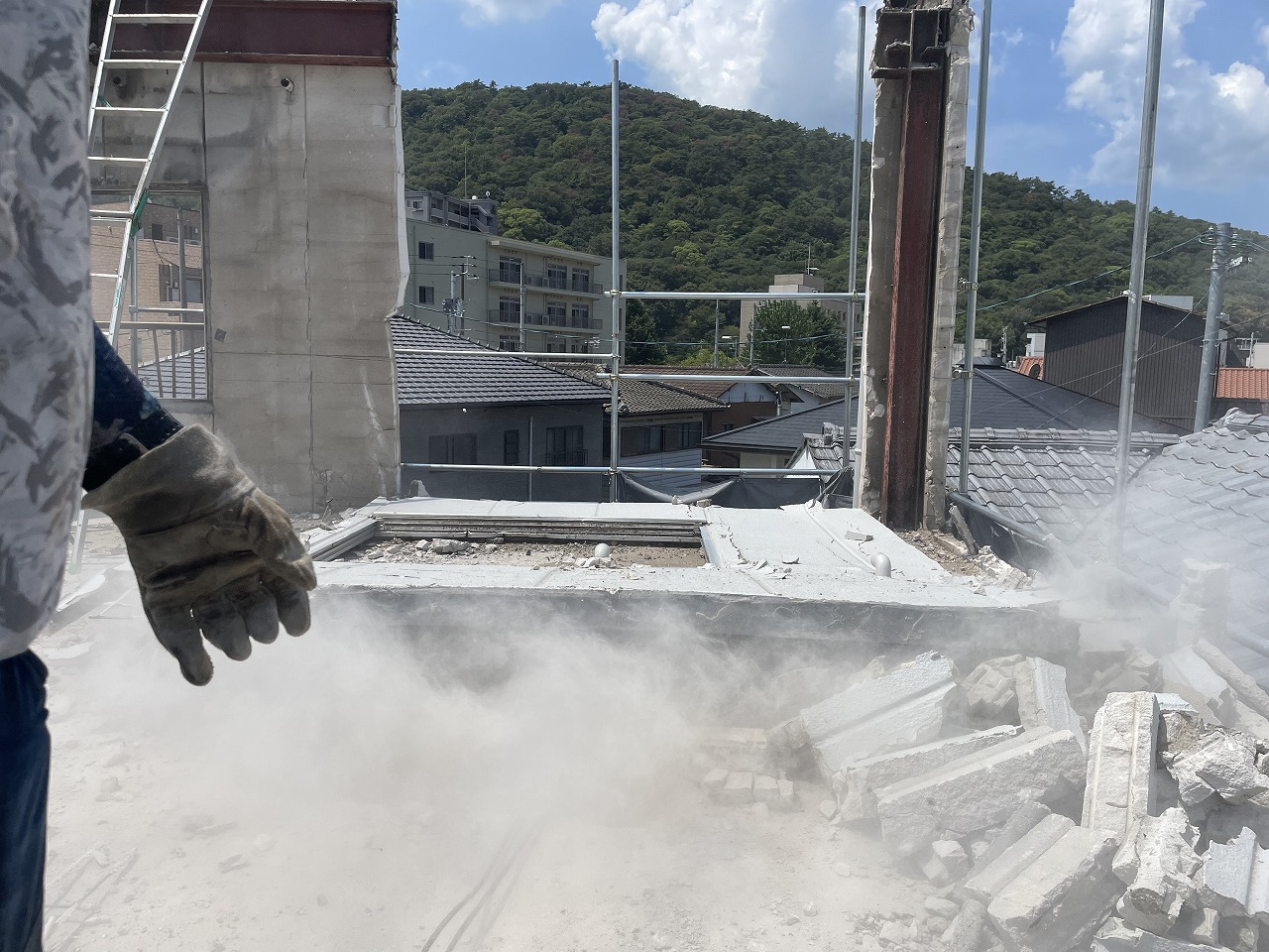 建屋周囲が狭く大型重機が入らないため建物上部を人力で解体します。