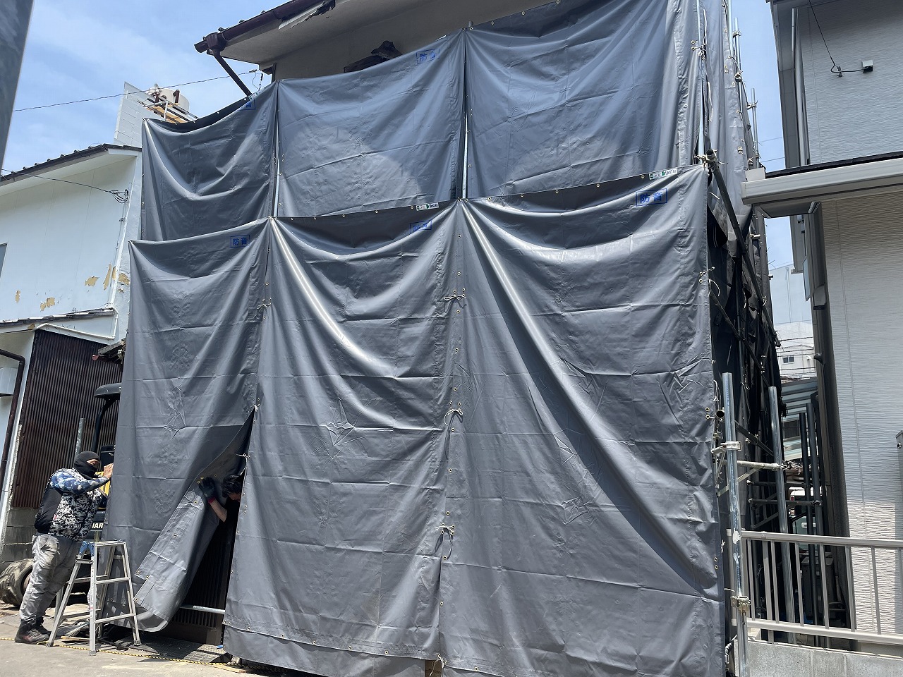 今回は解体物件の周囲が住宅街ですので防音シートにて足場の設置になりました。