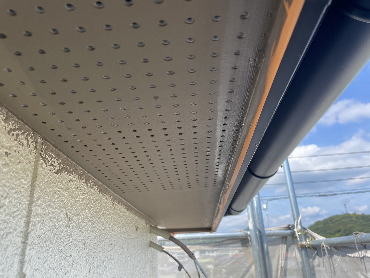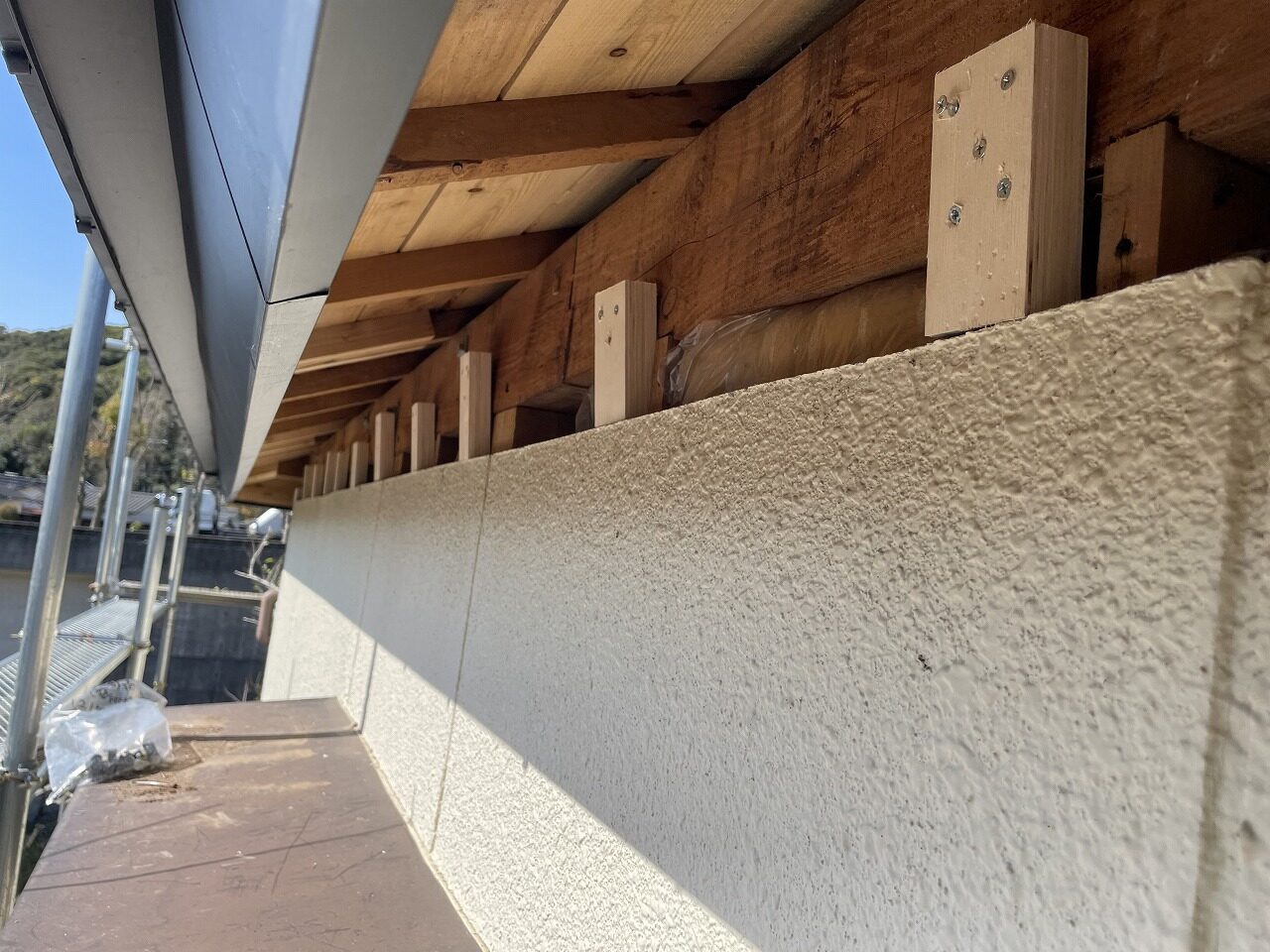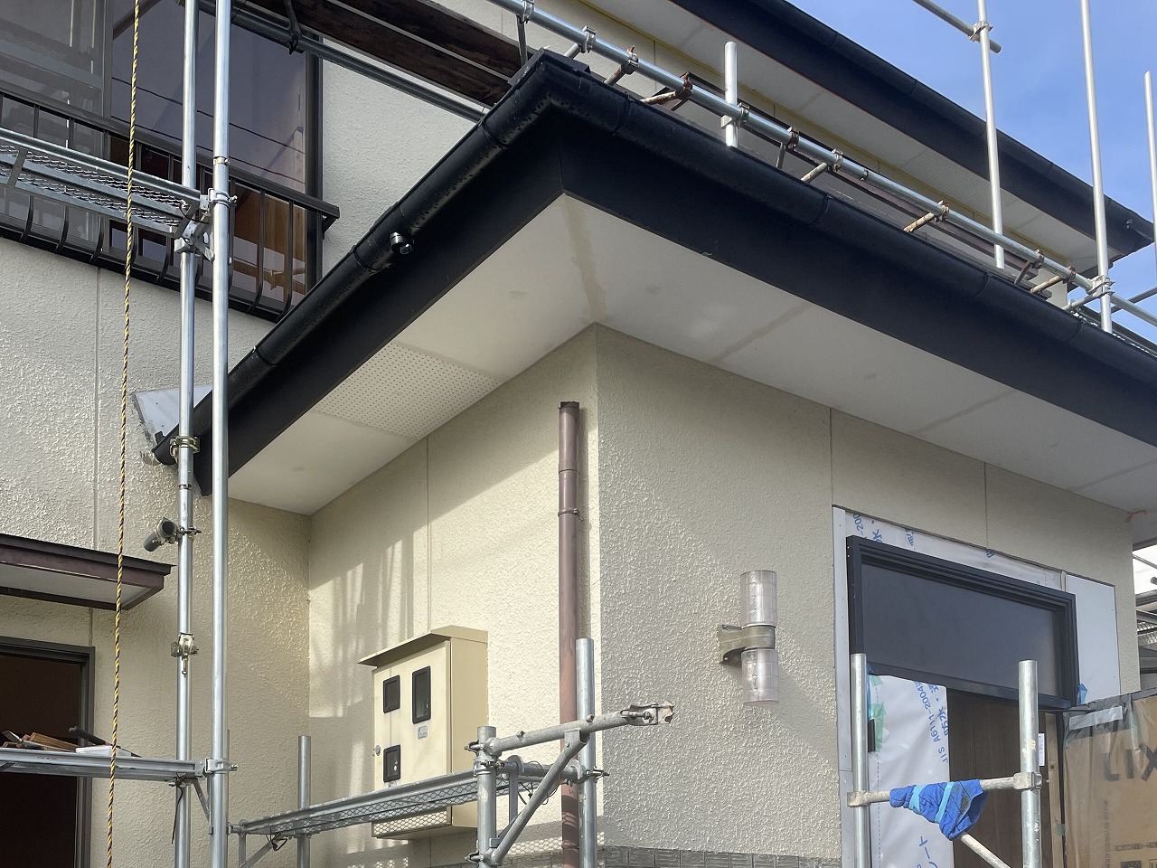次の工程として外壁塗装に入るのですが塗装前に軒天を張ったり、外壁の補修と雨戸の撤去と外壁の復旧を行いました。