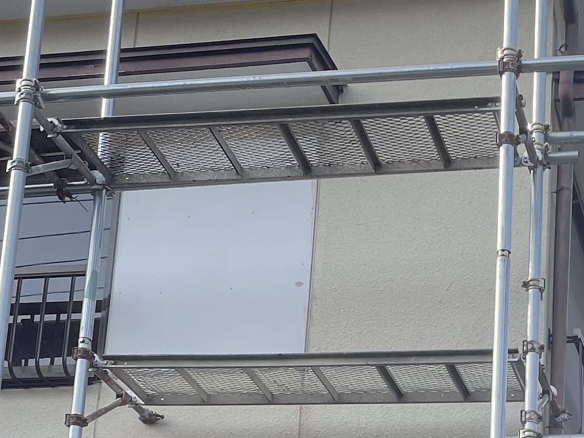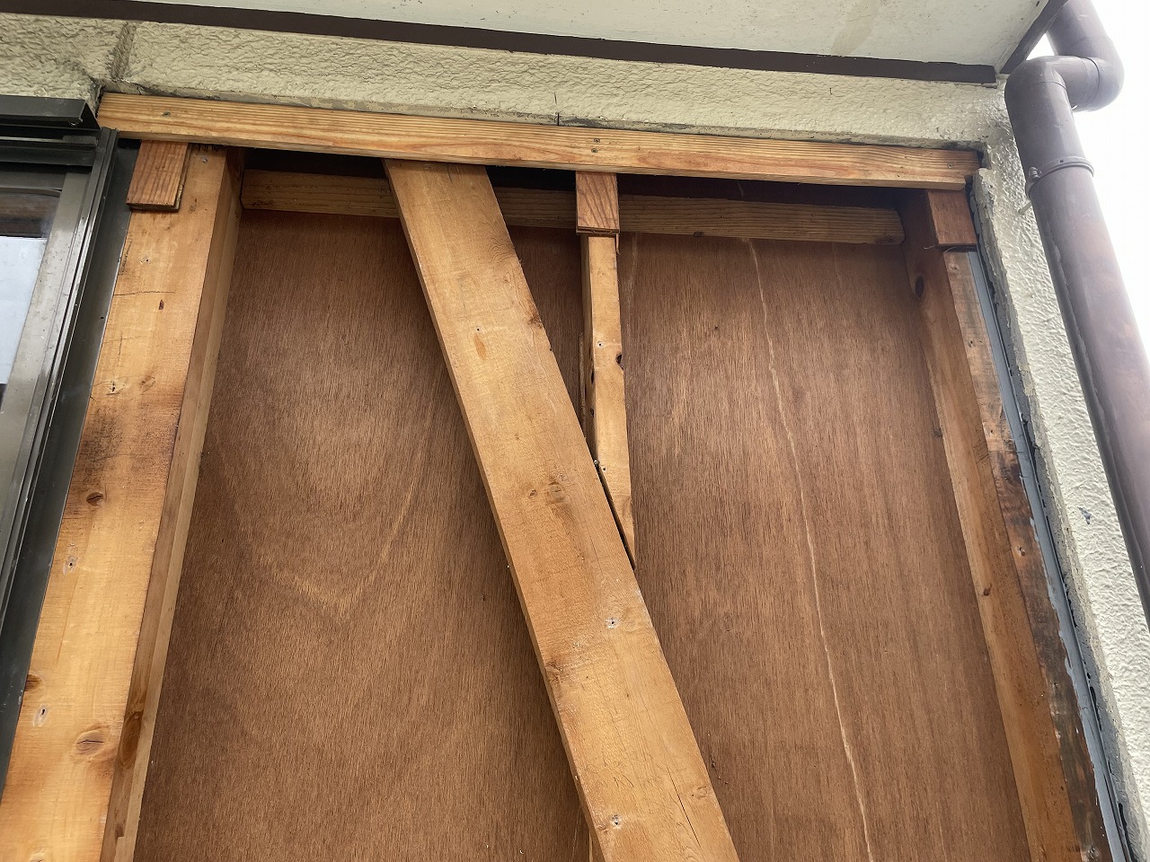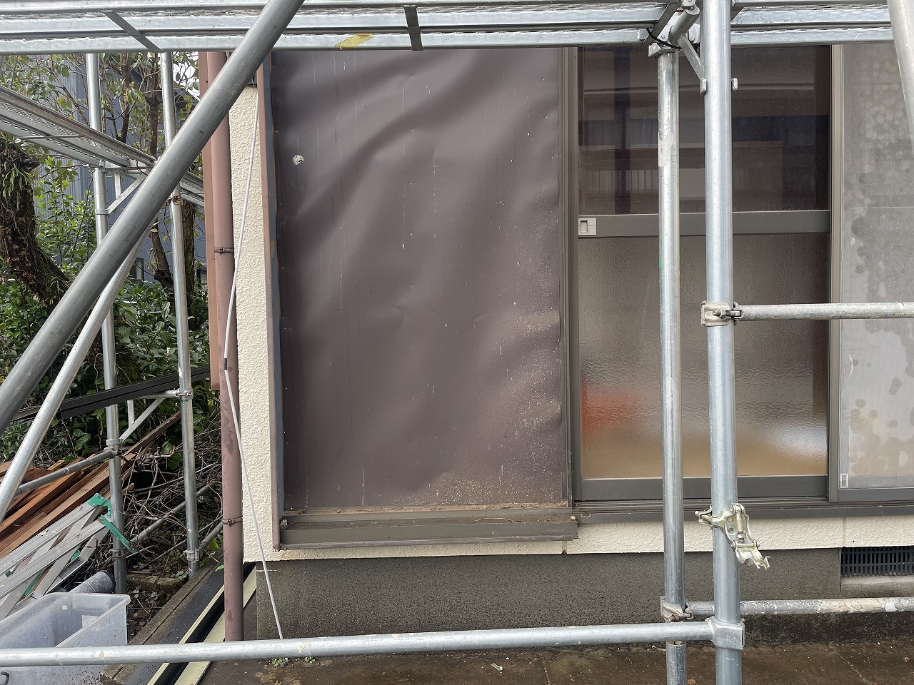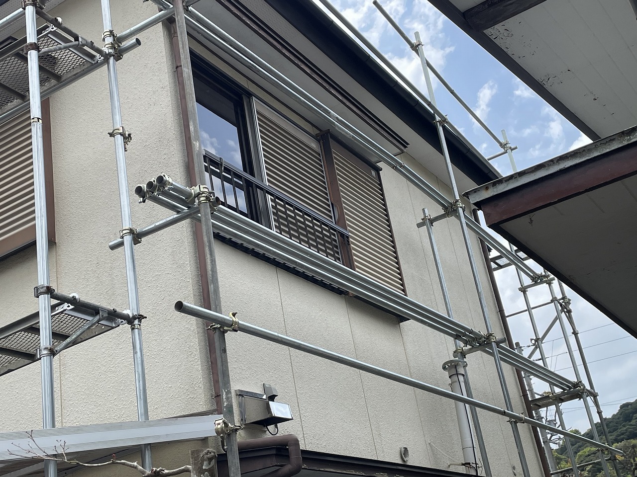 次の工程として外壁塗装に入るのですが塗装前に軒天を張ったり、外壁の補修と雨戸の撤去と外壁の復旧を行いました。