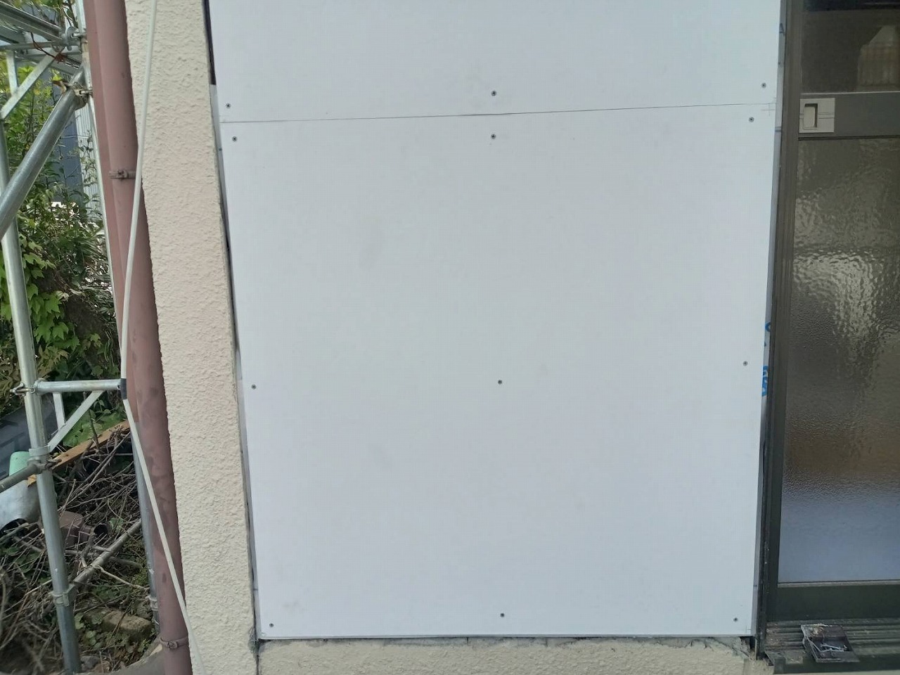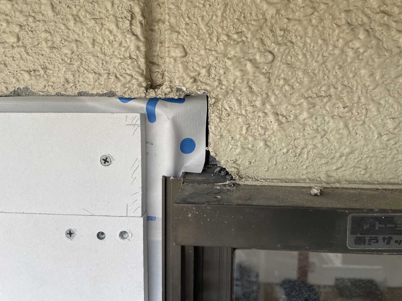 雨戸の戸袋部分を同じく下地の上に透湿防水シートを張って12mmのケイカルボードを張り周囲はコーキングで仕上げます。