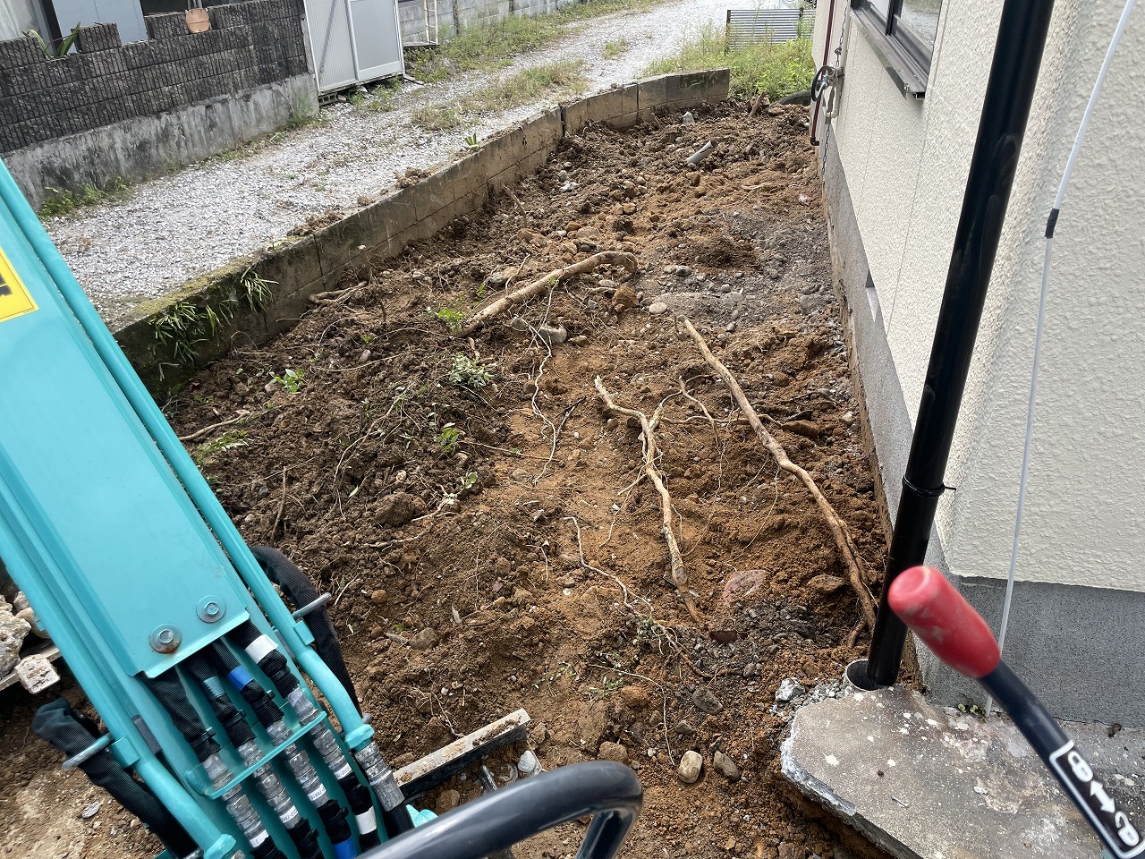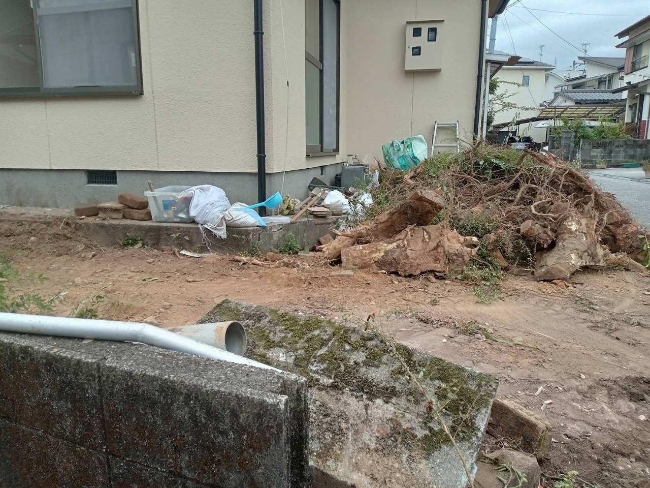 建屋南側の撤去した根を少しづつ手前側に集めてきました。