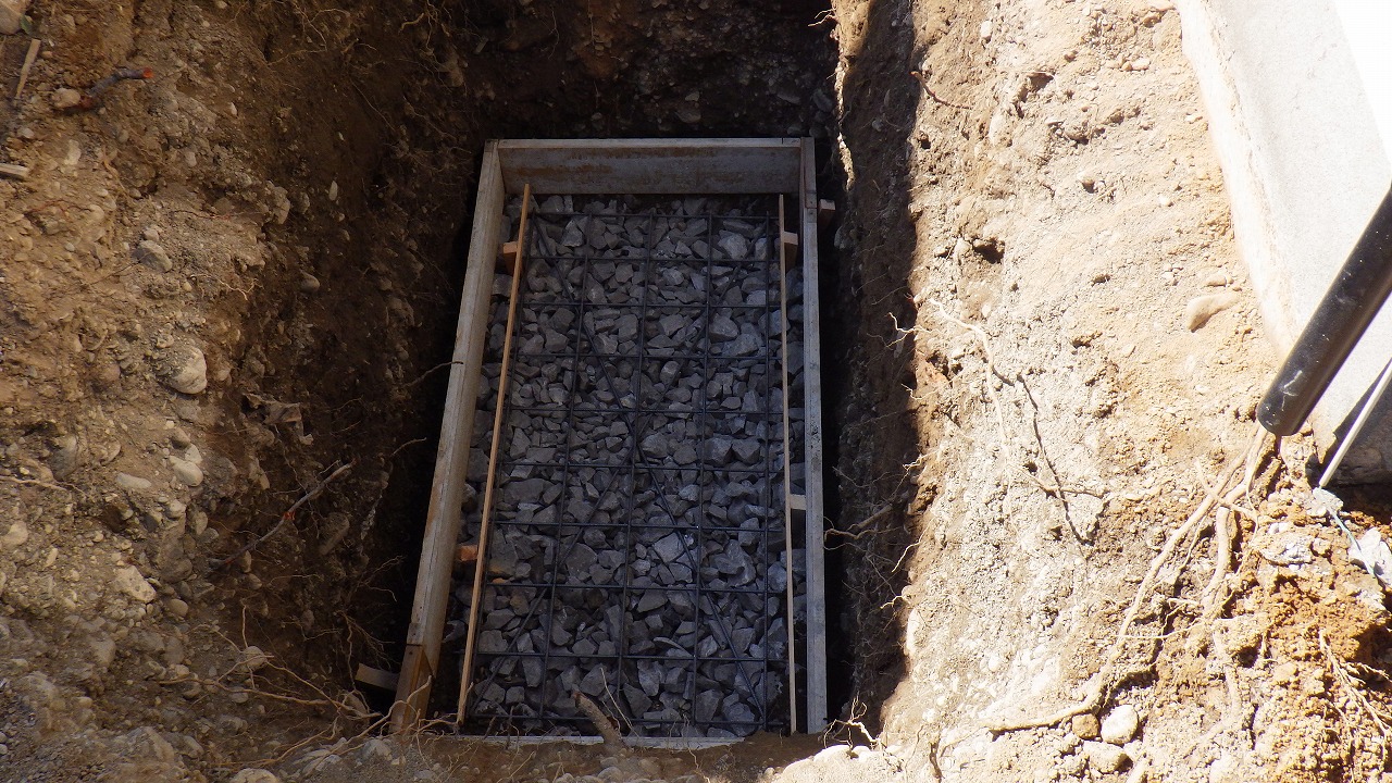 建物東側に浄化槽本体を設置するために試掘して位置出しをします。