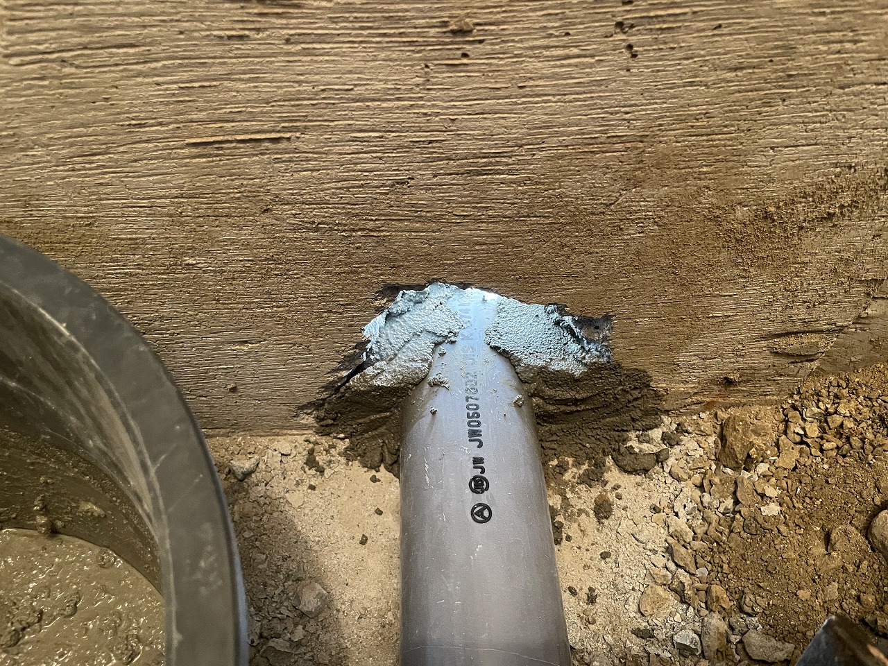基礎に空けた穴と排水管との隙間をモルタルで埋めていきます。